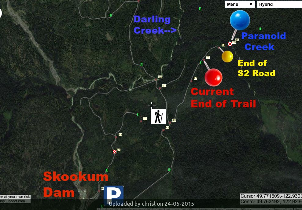 Work begins at the current end of the trail (see the Red tack on the map bellow) and will follow the S2 Road until the Yellow Tack. A short trail will then be constructed from the end of the Road to Paranoid Creek (the Blue tack on the map).
