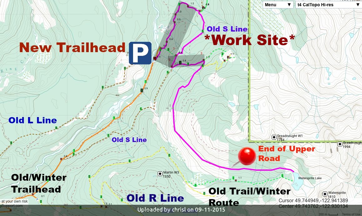 This trip will be the first in a series of trail clearing and construction trips dedicated to the New Watersprite Lake Trail. This installment (Round 1) involves the clearing of the "S Line" above the Skookum Private Power Project Water Intake Dam. This is labeled *Work Site* on the map, and is a casual 30 minute hike from the trucks. The aim of this trip is to connect the two pre-cleared sections of the S Line by clearing the moderately infested alder road in between.