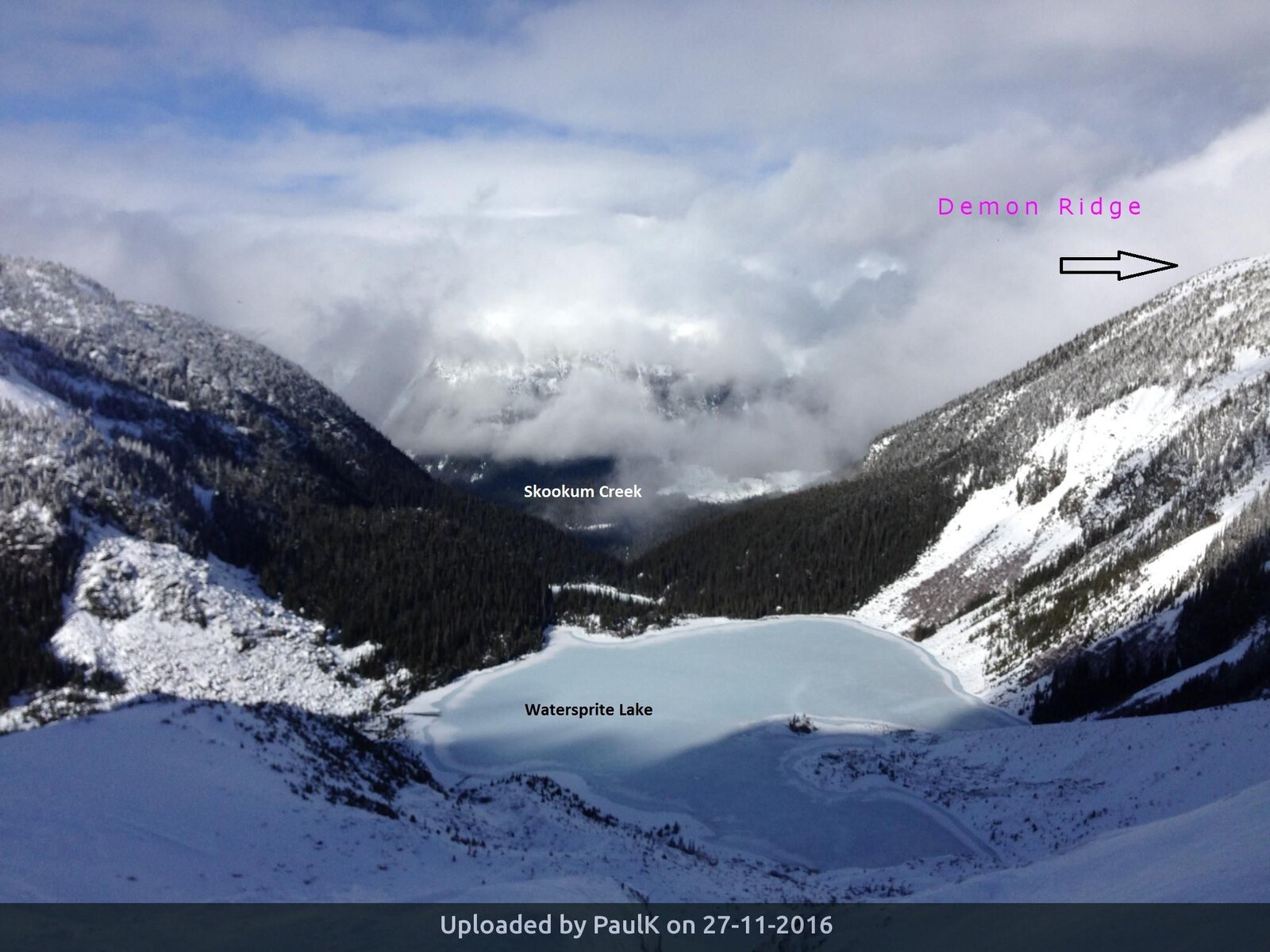 Due to fluctuating snow conditions, there may be some walking along the logging road and new Watersprite Lake trail required. So be prepared to carry skis and boots on your backpack for several easy kilometers. The condition of the trail with fresh and shallow snow may be a concern. Be prepared for some alder across the trail.