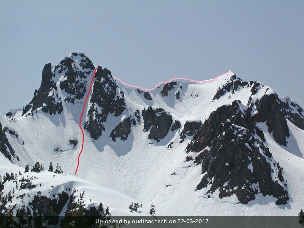The Climb: Expect 500 m of snow to about 45-50 degrees, possibly with a steep bit at the summit. Concern is the cornice not to mention avy conditions.