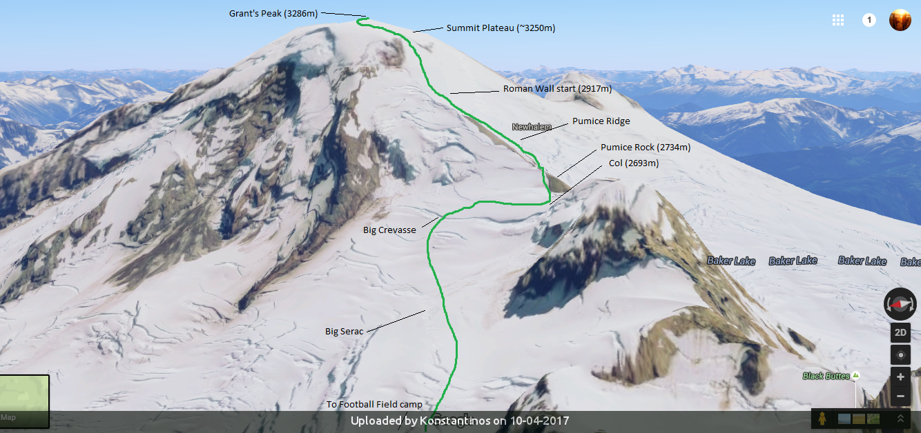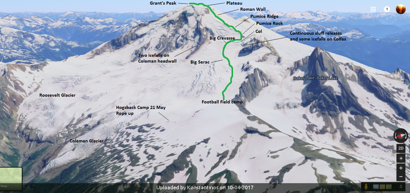 The plan is to do an overnight trip. We will approach the mountain on Saturday morning via the Heliotrope Ridge and camp at either Hogsback (longer summit travel but with more time on light packs) or Football Field (shorter summit travel but with more time on heavy packs). We will then travel up to the summit via the Coleman/Deming route early on Sunday morning (alpine start not needed but again conditions will dictate that). Skiing the Roman Wall is a decision that will probably be made once we are at Pumice Ridge. After the summit, we will ski down to camp, break camp, and ski/hike out to get ourselves some (hopefully) well deserved burgers from Bob. More details will be figured out once we have more beta on the condition of the route, plus approach road conditions. See attached screenshots of the previous trips I did but keep in mind they were in June with a lot less snow.