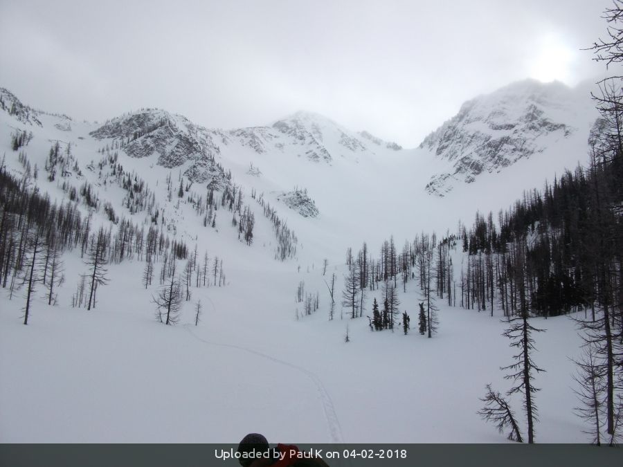 Twisted tour: Approach via the Frosty Mountain trail to the larch meadows (first up). Bowl skiing from the ridge down into Frosty Creek (first down). Back up Frosty Creek to col between east and west peaks (second up). Thence to Frosty Mountain east peak (the around). Descent down the north face and the trail (third down).