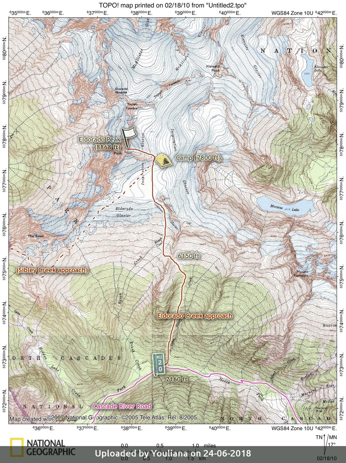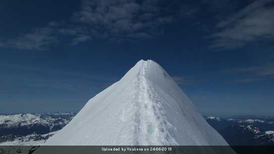Called the "Queen of the Cascade River" this mountain is in the middle of a collection of beautiful peaks. The climb is not technically difficult but includes glacier travel and a knife-edge (about 60 cm/2 ft wide) low-angle snow arete near the summit.