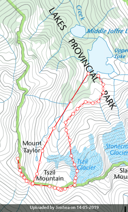 The plan is to head up early on Sunday morning and park at Joffre Lakes trailhead (at approximately 7am). Then we'll hike up the Tszil glacier (to get some glacier travel in) and head up to Tszil mountain and over the col to Taylor before descending back to the carpark (either from the Tszil-Taylor col, or down the ascent route).