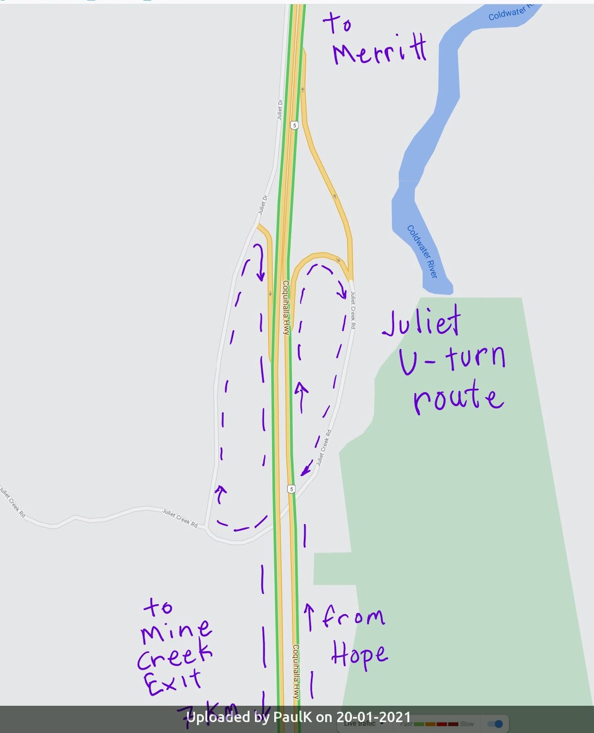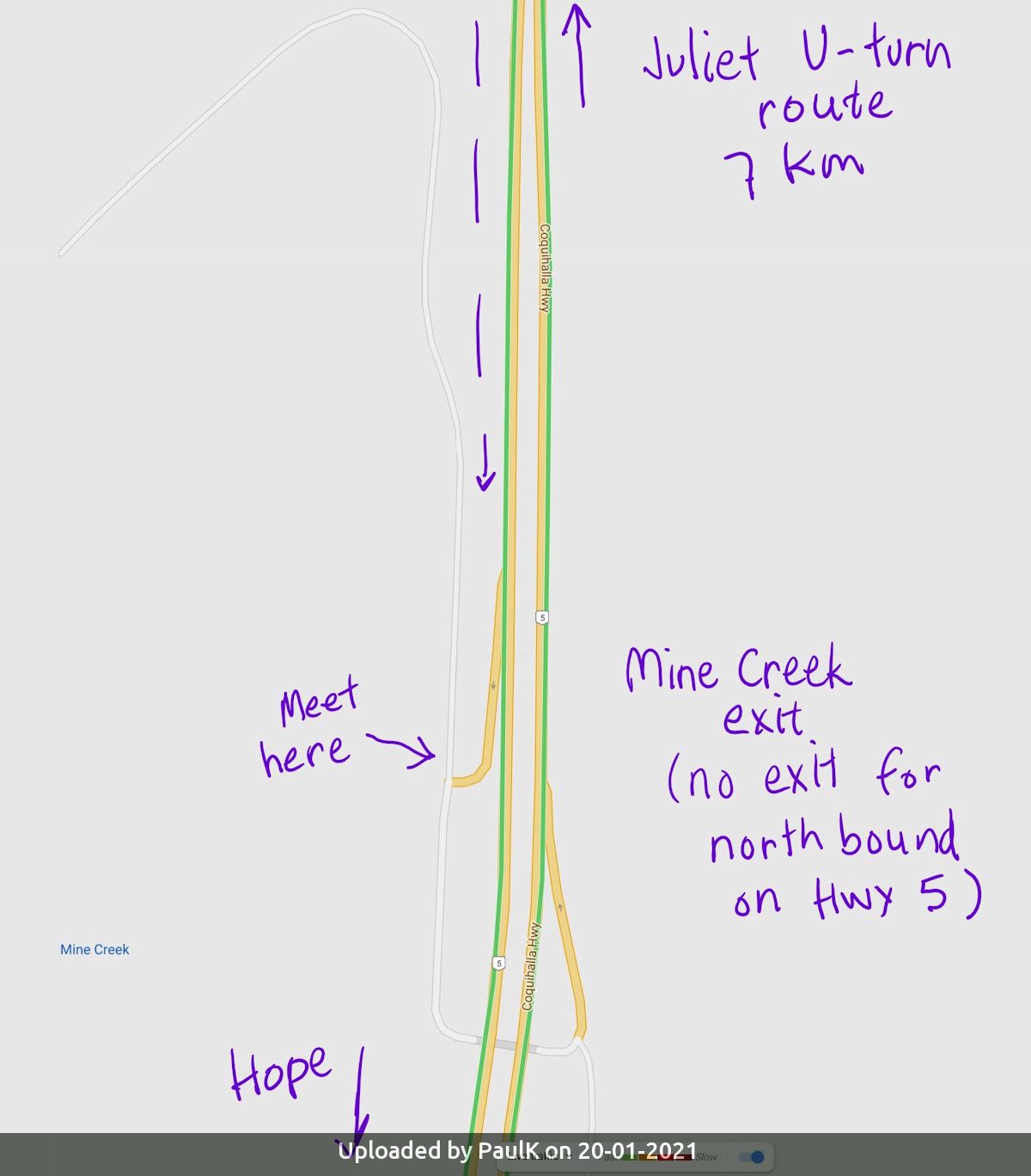 The parking is reached off Exit #238 (Juliet exit) on Highway 5. You must do a U turn at Juliet and head back south to Exit #231 (Mine Creek exit). See maps. We'll meet at the Mine Creek exit off the highway and figure out where to park.