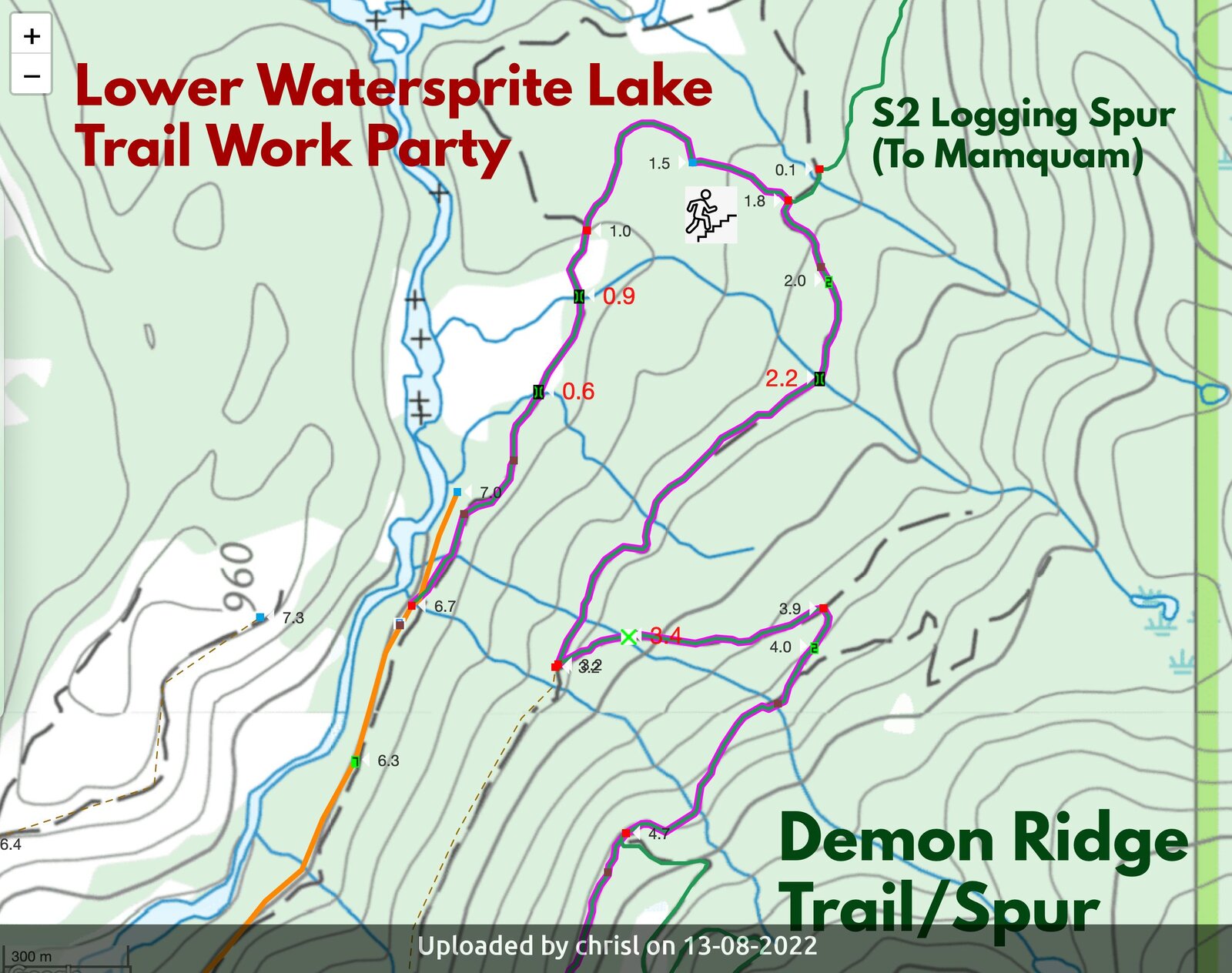 Crew 2: will focus mostly on brush clearing of the lower four KM of the trail. Additionally, the first 800 meters of the S2 Logging Spur leading to Mamquam Mountain needs clearing, as does the lower 750 meters of the Demon Ridge Trail. These latter issues may require an additional trip.