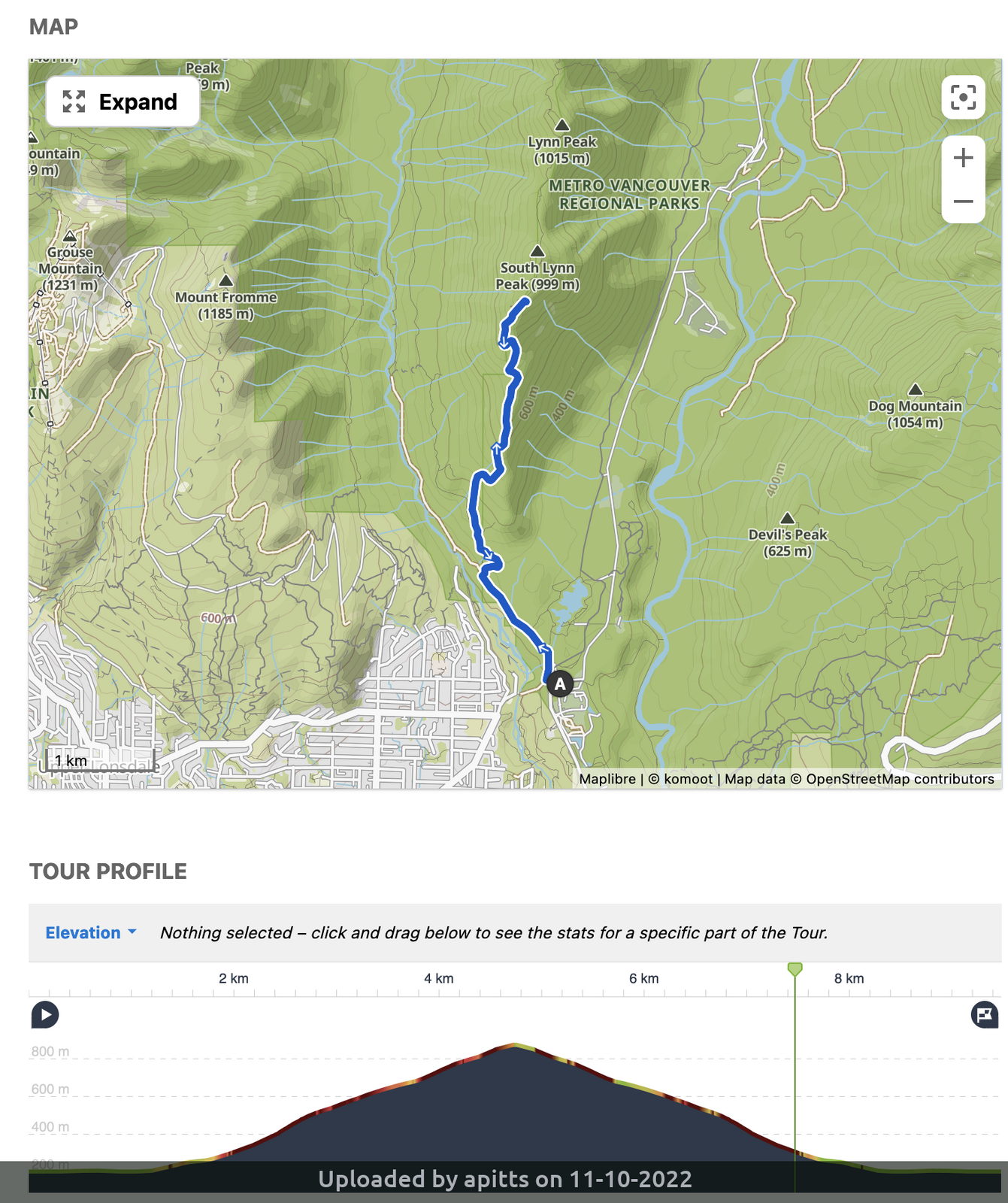 It's around a 10km hike with 700m elevation gain to a nice viewpoint over the city. Last time I was up there took me 4-1/2 hours moving time (return), just under 6 hours total. We were told by other hikers the peak itself was underwhelming, and also that was in the spring when it was snowy, so we turned around at the viewpoint. Most of the elevation is gained by the viewpoint; if folks are keen we could keep going for a bit to see if those reports are true.