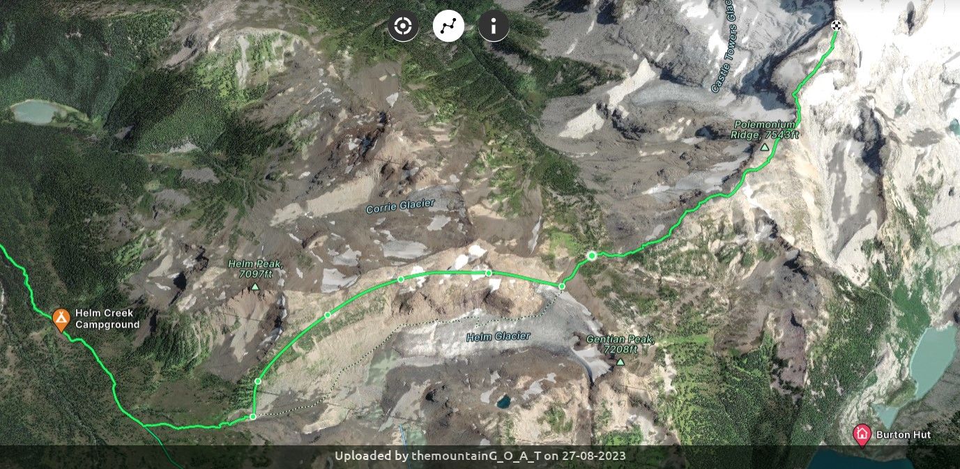 Day 1: Drive to Cheakamus lake parking lot early Saturday, hike past Helm Creek campground and camp above Helm glacier or col between Gentian Peak and Castle Towers. Helm Creek campsite is fully booked, that's why we have to camp inside wilderness camping zone, $16 fee. Distances provided assume we camp at the col: 15km total, 1000m vertical displacement, 1400m gained, 400m lost.