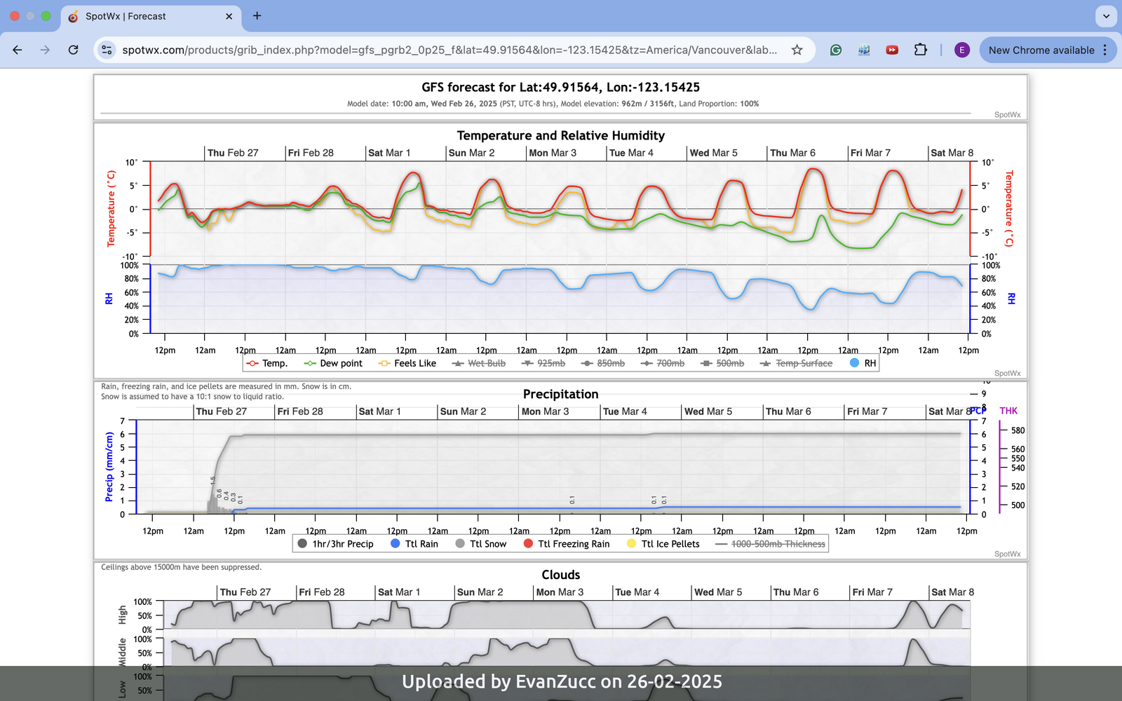 Weather (as per spotwx GFS of tantalus lookout point on Feb 26): high of 7.7 at 2pm, low of 3.9 at 1000. Humidity in the 70s. No rain no snow. Minimal clouds. Screenshot of forecast is uploaded in trip photos.