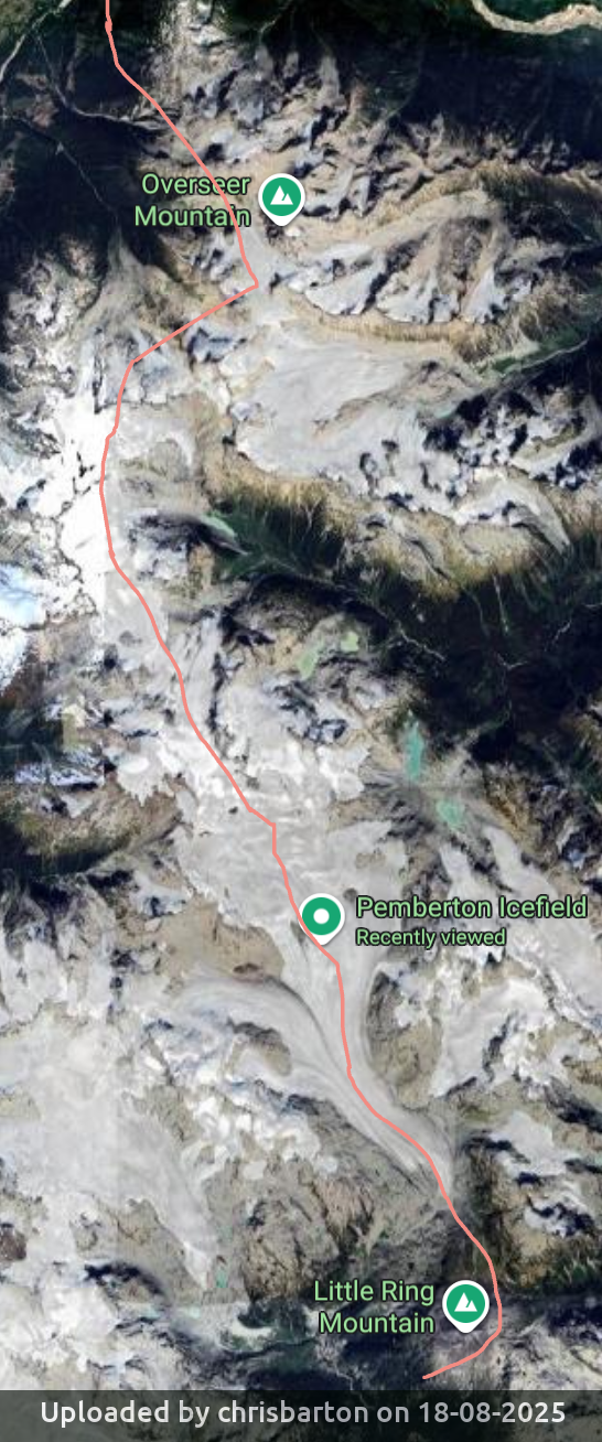 PEMBERTON ICEFIELD TRAVERSE. TWO FOUR-DAY OPTIONS. Ideally need two groups of 3 or 4. One starts at Little Ring Peak at Squamish river headwaters Saturday morning, the other at Pemberton Meadows (N. Of Overseer Mtn.) Friday evening. The Icefield should be largely bare, but at the top (2400m) there may still be snow. On the icefield need microspikes for most terrain, and snowshoes for any snow. Each group will also need rope and crevasse rescue gear. As the trailheads are so far apart, the idea is to meet in the middle and use the other car at each end.